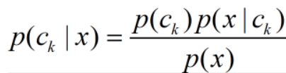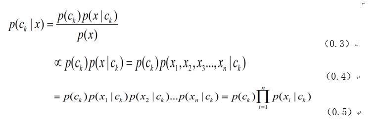 其中, (0.3) 是贝叶斯定理, (0.4) 是因为分母的概率 p(x)与我们关心的类没有关系(这里符号 ∝ 是 “成比例” 的意思), 而 (0.5) 是因为假定了 观测值 x1,x2,...,xn在给定了ck的条件独立性.