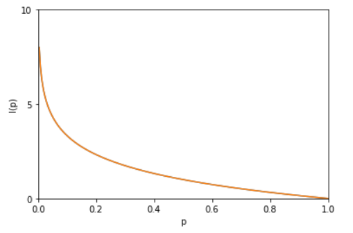 其中“-”是用来保证信息量非负。而 log函数的基选择是任意的(信息论中基选择为2;而机器学习中基常常选择为自然常数e)。I(x)也被称为随机变量x的自信息 (self-information),描述的是随机变量的某个事件发生所带来的信息量。图像如下: