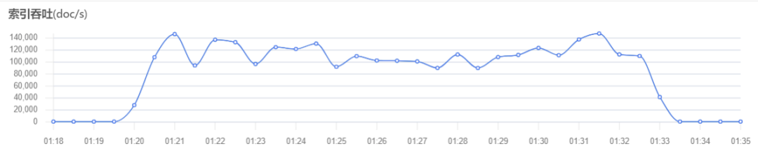 在开始测试极限网关在限制索引写入速度之前,我们先测试一下不作限制时的测试环境写入速度。在不作限制的情况下,测试环境的写入速度在 9w - 15w docs/s 之间波动。