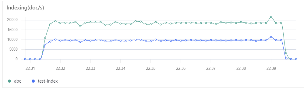 我们可以观察到两个索引的写入速度稳定在我所设定的限制下。