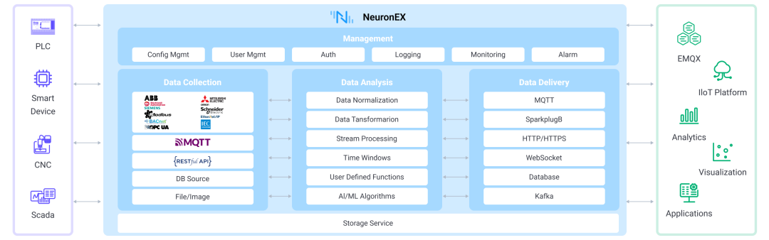 如上图所示,NeuronEX 主要分为数据采集接入、数据处理分析、数据转发存储以及系统管理等模块。