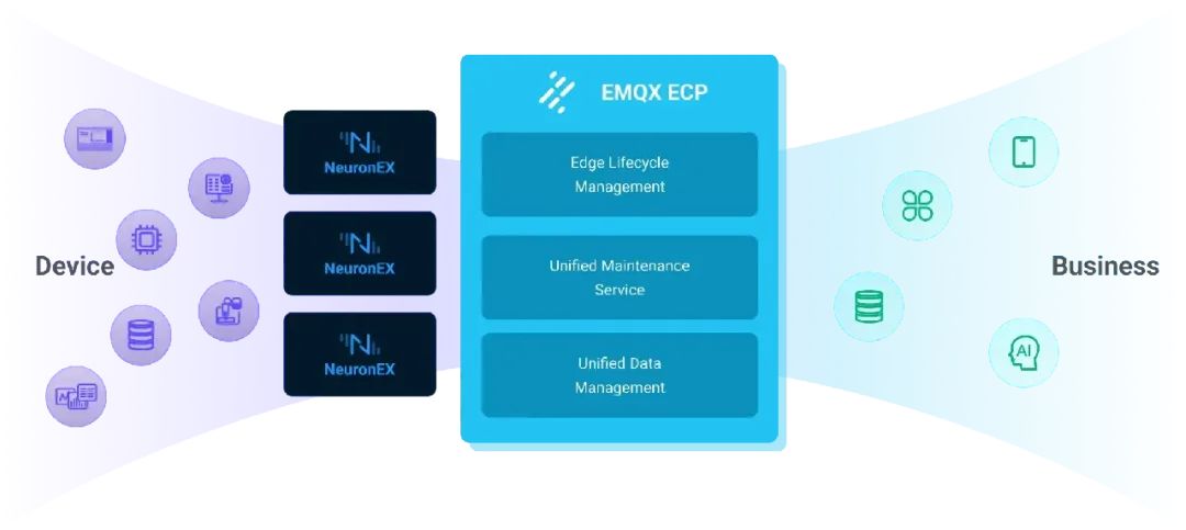 为了融合在边缘 OT和 IT 端的不同需求, EMQ 正式推出了工业互联数据平台 EMQX ECP。该平台旨在帮助领域内相关企业应对工业互联网边缘端所面临的挑战,满足工业场景大规模数据采集、处理、存储和分析的需求。ECP 提供边缘服务 NeuronEX 的快速部署、远程操作和集中管理等功能,促进工业领域数据的互联互通,实现数据驱动的生产和运营。下文将分别对 NeuronEX 和 ECP 进行介绍,讲解 EMQ 是如何通过这两款软件解决上述问题的。