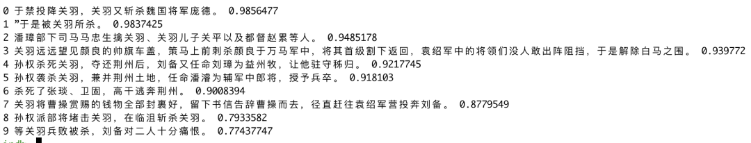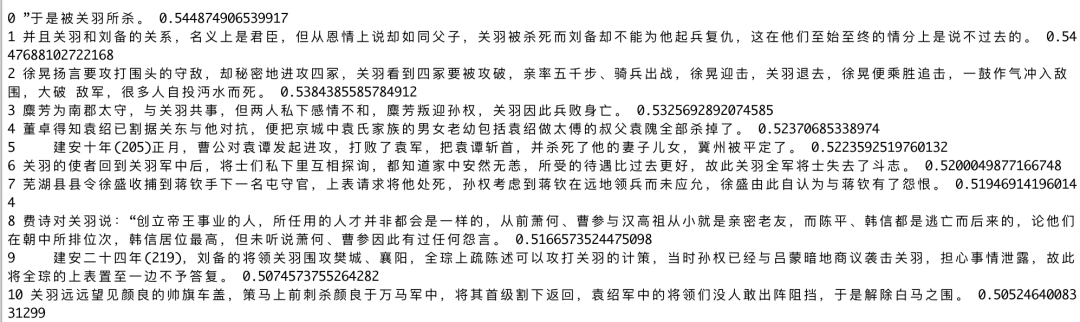 我们使用 cross-encoder 方式设计的 rerank 模型(BAAI/bge-reranker-large)来进行文本相关性的计算,rerank 模型通过输入(问题,文档片段)直接生成分数,所以可以同时接收到二者的信息。用比喻来说,embedding 召回就是看简历留下大致印象,rerank 就是一对一的进行面试,所以通常的情况下都能进一步提高结果的相关程度。通过这个技术,我们找到了所有关羽杀死他人的文本,当然也包含了一些关羽被吴国杀死的信息。