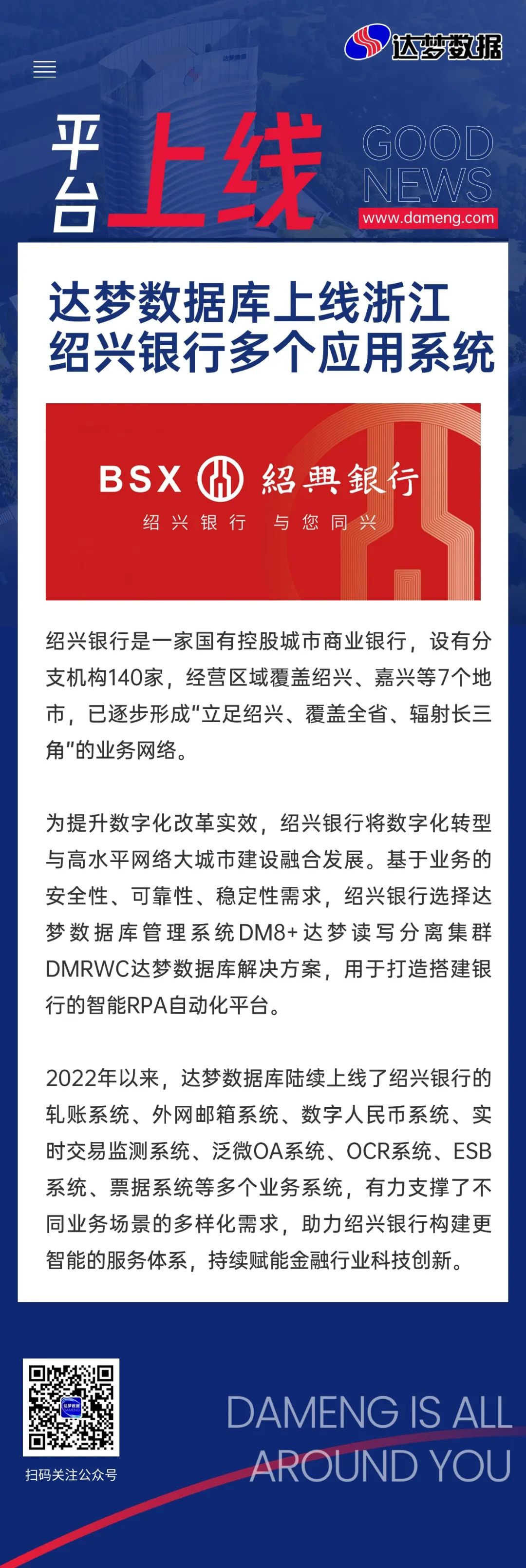 龙年开门红丨达梦数据库上线浙江绍兴银行多个应用系统!