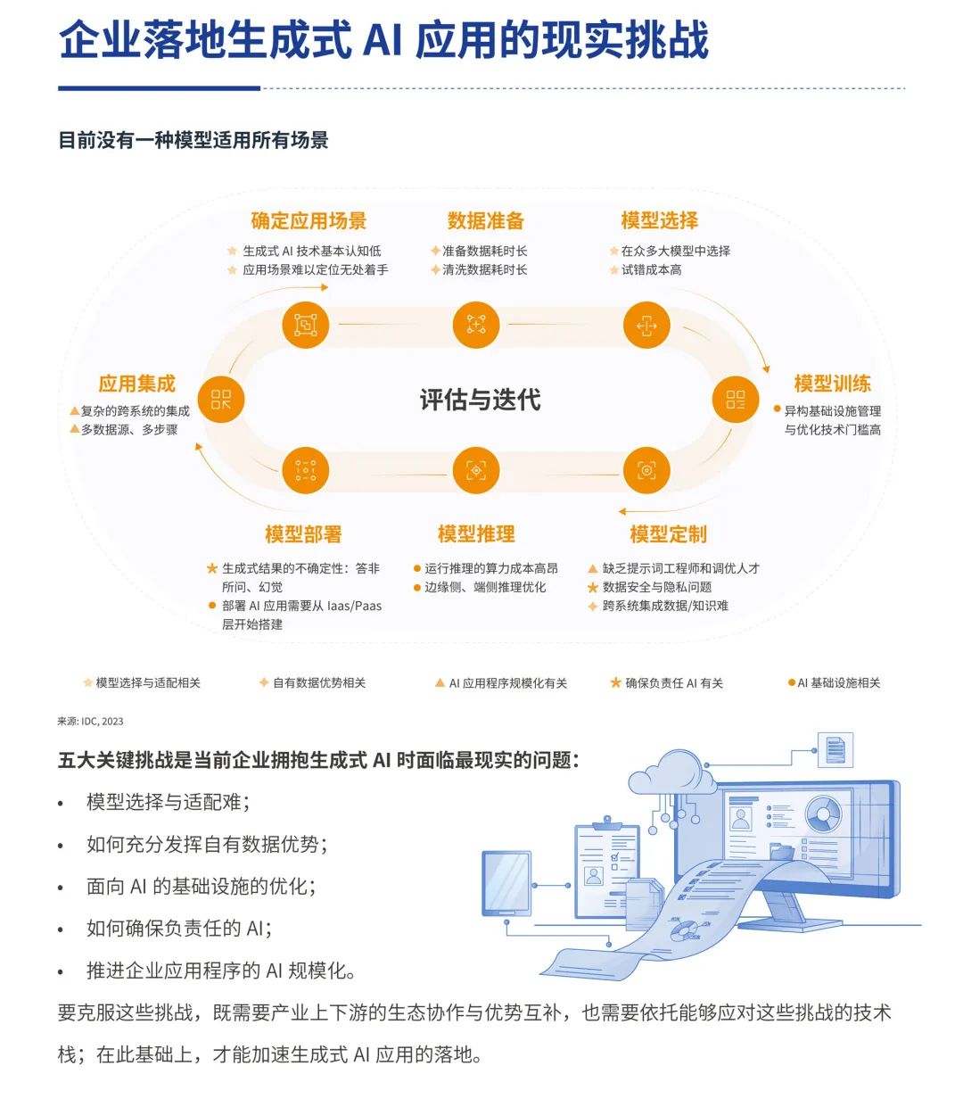对于生成式 AI 应用开发者而言,需要为应用场景选择最为适配的模型,也需要集成来自不同存储库、不同格式的数据,还需要保障用户数据隐私、模型安全以及生成内容的安全。