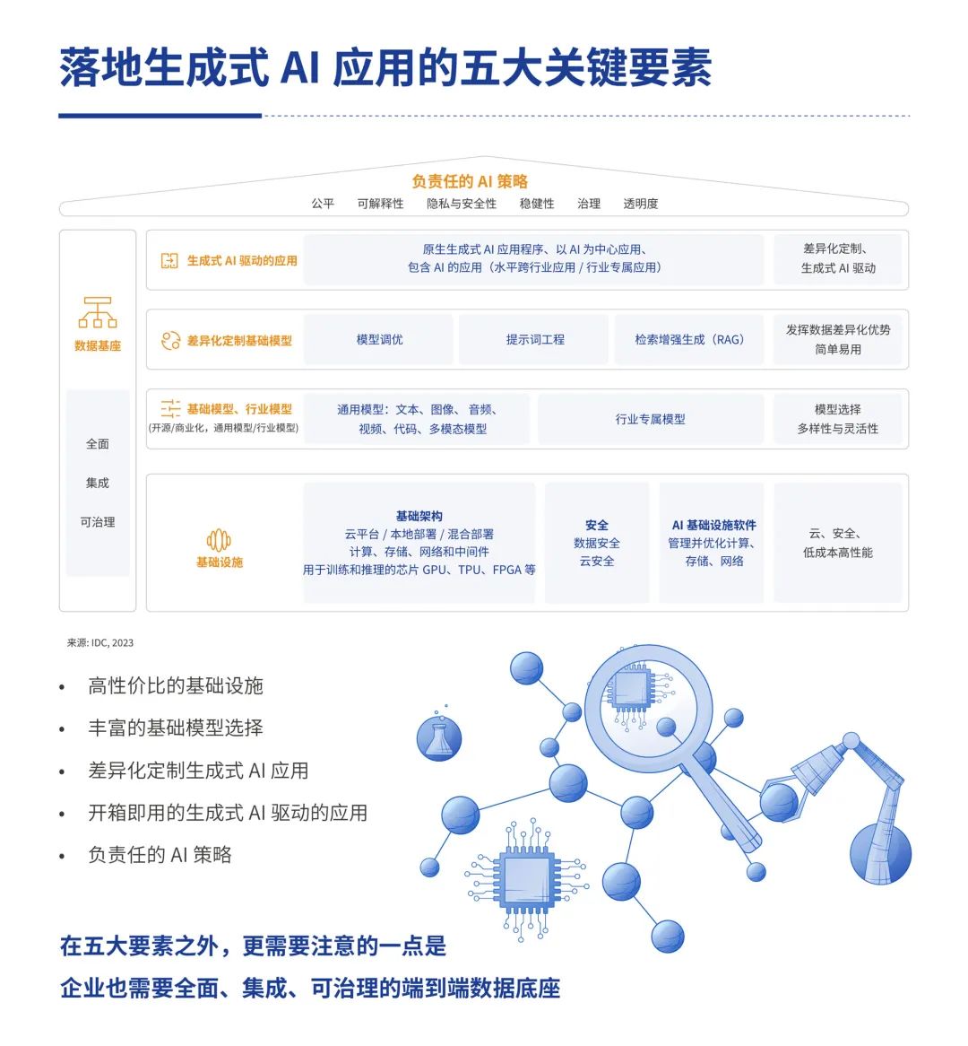 生成式 AI 要在企业场景落地,5(五大关键要素)+1(一套端到端数据战略)固不可少。整体来看,能够帮助生成式 AI 新生态里的产业参与者加速生成式 AI 应用落地的解决方案,必须具备五大要素:高性价比的基础设施、丰富而灵活的模型选择、使用私有数据实现差异化定制、开箱即用的生成式 AI 驱动的应用和负责任的 AI 策略。