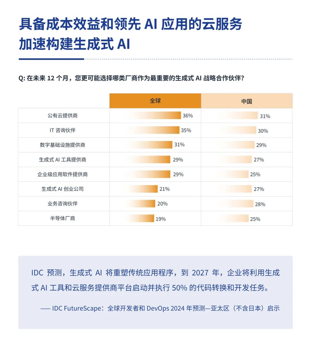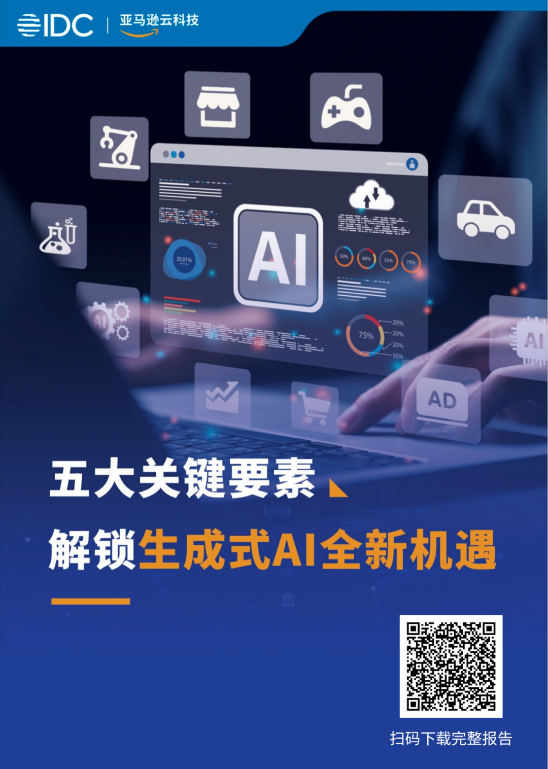 为此,IDC 携手亚马逊云科技联合开发并重磅发布《五大关键要素 解锁生成式 AI 全新机遇》白皮书,围绕企业场景中的生成式 AI 落地和应用研究分析生成式 AI 产业趋势和技术路径,针对各类客户进行问卷调研和分析师访谈,深度解析不同类型的市场参与者在生成式 AI 领域面临的现实挑战,指出企业解锁落地生成式 AI 应用的五大关键要素,以及借助云服务商一起端到端构建和落地生成式 AI 应用建议。