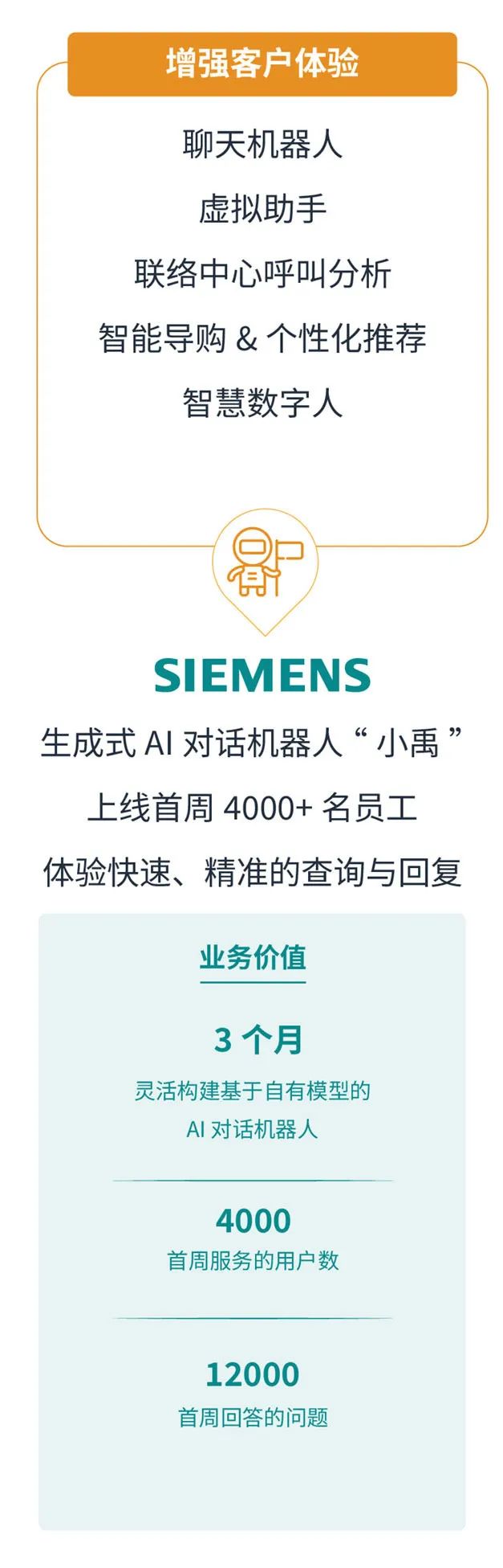 有必要尽快将生成式 AI 融入企业级战略,确定是自建模型还是使用模型定制功能来发挥企业的差异化优势。在参考外部诸如提高生产力、增强用户体验以及优化业务流程成功实践的同时,筛选确定自身应用场景。目前落地的典型应用场景主要围绕增强客户体验、提升员工生产力与创造力以及优化业务流程等,典型应用场景与企业成功应用案例如下图所示。