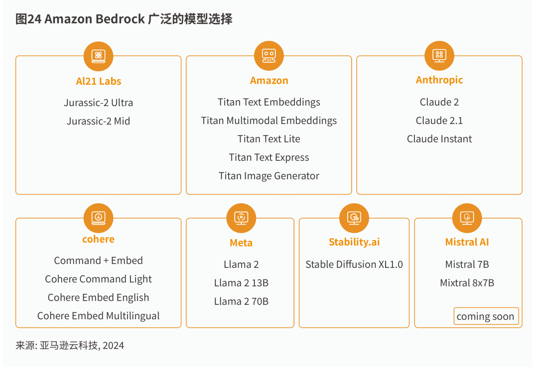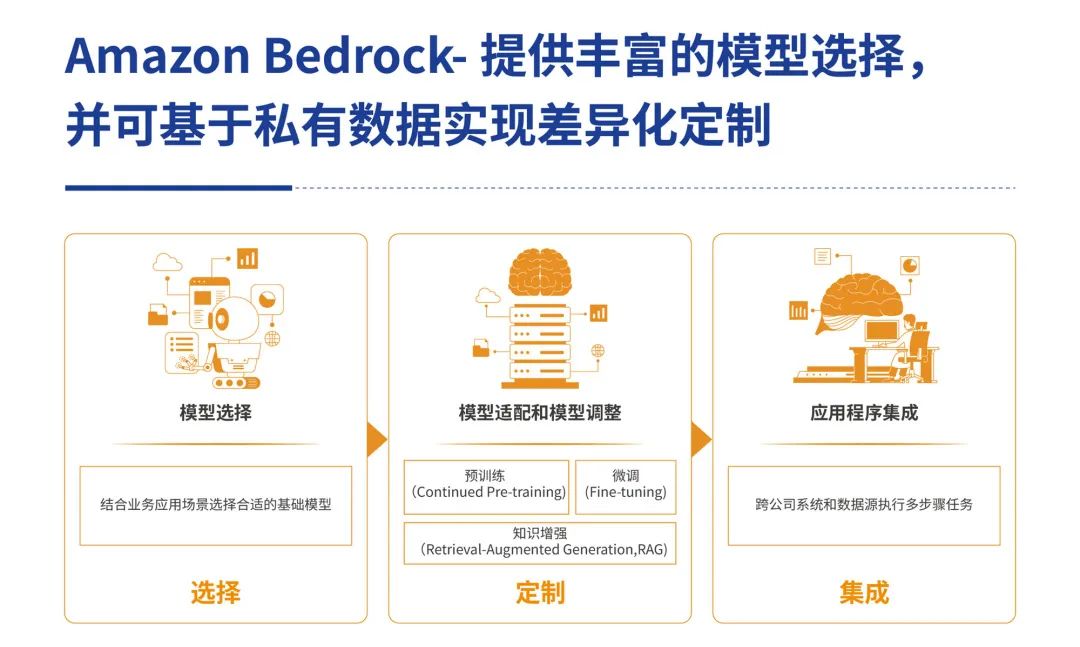 推出 Amazon Bedrock,Amazon Bedrock 能够高效评估、比较和选择最适合其应用场景和业务需求的模型,通过 RAG、微调以及提示词工程实现模型定制功能,助力轻松构建并规模化生成式 AI 应用。Agents for Amazon Bedrock 能够加速并降低应用集成门槛,集成公司内外部数据,制定数据安全和隐私策略,从专有数据源检索所需信息并提供准确响应。