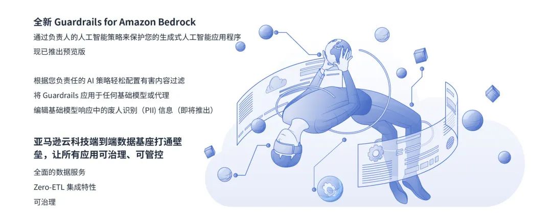 除此以外,亚马逊云科技高度重视为用户提供负责任的 AI 策略支持,也在持续建设端到端的数据基座以支持生成式 AI 的数据集成需求。