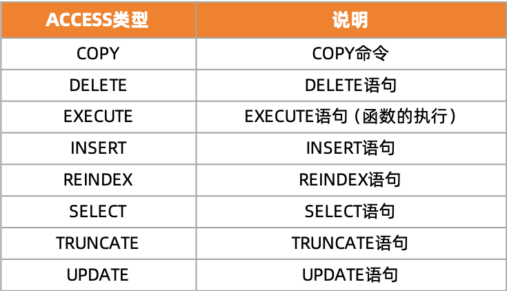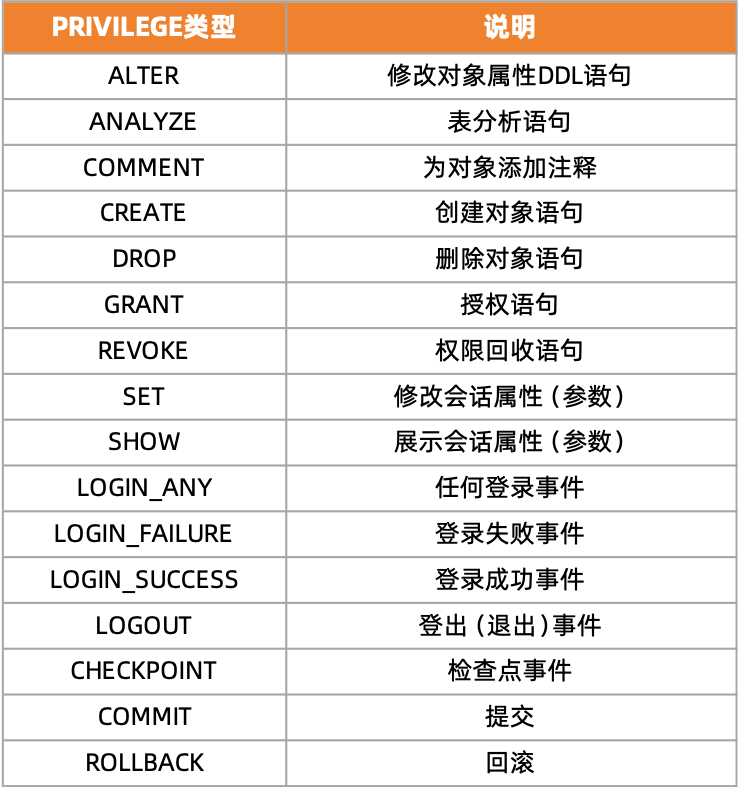 (3) PRIVILEGE类型:Vastbase支持的PRIVILEGE权限审计类型如下表所示: