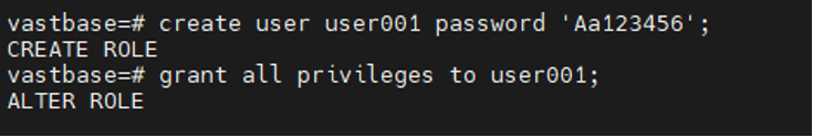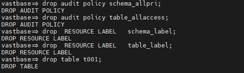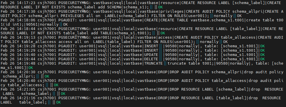 (9) 查看审计日志,less /var/log/vbaudit.log,可以看到user001针对schema_s1的create table操作及t001的DML操作均记录在了审计日志中