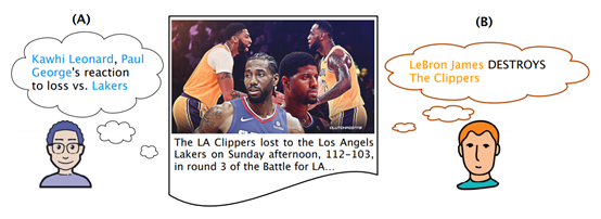 什么是个性化新闻标题呢?举个例子,有一篇报道篮球比赛的新闻,其潜在的用户受众通常是比赛球队的球迷。如果新闻标题不考虑用户的阅读兴趣,只是客观地描述比赛结果,那么输球一方的球迷进一步阅读这条新闻的概率可能较小,因为当他们看到标题时就已经知道自己支持的球队输了比赛,再具体了解输球过程的意愿就会相对较低。但是,如果考虑用户的阅读兴趣,对不同球队的球迷呈现个性化的标题(如图1所示),那么即使是输球方的球迷,可能也愿意去了解这条新闻的内容。比如,以球迷支持的球星为标题的核心词,突出球员的个人表现。