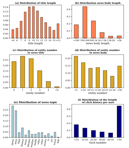 图2:PENS数据集新闻标题和正文长度分布(a,b)标题和正文中实体数量分布(c,d)、新闻主题分布(e)和用户点击历史长度分布(f)