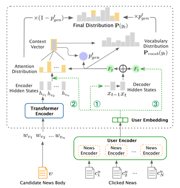 用户个性化注入,所提出的框架共设计了三种形式:①将用户个性化表示( User Embedding ) 作为指针网络解码器的初始隐藏状态,进而实现影响生成词语的总体概率分布 P(w_t);②将 User Embedding 加入到对正文单词注意力分布 a_t 的计算中,区分不同用户对正文单词的关注程度,从而影响解码器从原文复制单词的概率分布 P_copy;③将 User Embedding 加入到 p_gen^t 的计算中,从而影响解码阶段的单词是来自词表生成还是来自正文复制。