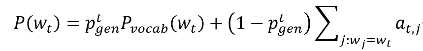 标题生成器,由 Transformer 编码器和指针网络解码器组成。Transformer 编码器编码候选新闻的文本信息,学习新闻正文单词的隐藏表示 h=[h_(v_1),h_(v_2),⋯,h_(v_n)]。在解码过程的第 t 步,指针网络解码器首先会采用注意力机制来计算当前隐藏状态 s_t 对新闻正文单词的注意力分布 a_t=[a_(v_1),a_(v_2),⋯,a_(v_n)];然后基于此注意力分布,加权求和得到上下文向量 c_t;最后,原始词汇表中每个单词生成的概率分布 P_vocab,以及选择原始词汇或直接复制新闻正文单词的指针 p_gen^t,可由 c_t,s_t 等参数得到。最后第 t 步解码词的总体概率 w_t 分布为: