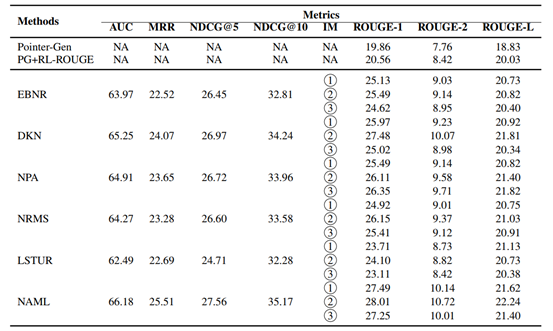 研究员们在 PENS 数据集上验证了该框架的效果。为了对比个性化与非个性化的差异,研究员们首先对比了两种代表性的标题生成方法:基本的指针生成网络(用 Pointer-Gen 表示)和用强化学习框架拓展的指针生成网络(用 PG+RL-ROUGE 表示)。由于论文中提出的框架并未限制用户表示的学习方法(它们通常可由个性化新闻推荐算法学习得到),因此研究员们采用了6种代表性的个性化新闻推荐算法:EBNR、DKN、NPA、NRMS、LSTUR 和 NAML。这6种个性化新闻推荐算法按照本文框架中的三种注入方式,分别注入研究员们提出的标题生成器,从而可以得到18种具体的个性化新闻标题生成方法。