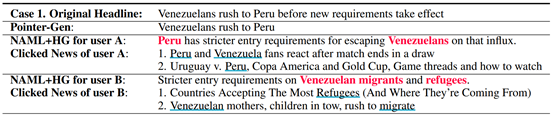 ②用户的个性化建模方法在个性化标题生成任务中起到了重要作用。更好的用户建模方法可以从用户行为历史中获得更丰富的个性化信息,进而生成更好的个性化标题。如 NAML 方法在用户兴趣建模的4项指标上均得到了最高分,同时也在3种个性化注入方式中取得了最高的 ROUGE 分数,这意味着该方法生成的个性化新闻标题质量更好。③第二种用户兴趣注入方式在大多数用户建模方法中表现最好。这可能是因为用户的阅读兴趣很可能具体表现为对正文中的人名、地名、事件等重点信息的关注,这些单词有更大的概率是通过指针网络解码器中的拷贝机制生成至标题中的,所以让用户兴趣表示直接去影响从正文复制单词的概率分布,也许是最直接、有效的一种方法。但是第二种方式并没有在所有用户建模方法中达到最佳效果(如 NPA、LSTUR)。因此,更好的用户个性化注入方式还有待进一步探索。本文针对个性化新闻标题生成进行了研究,并构建了名为 PENS 的数据集,这是第一个可以采用离线方式评测个性化新闻标题生成方法的基准数据集;此外,研究员们还提出了一个通用的个性化新闻标题生成方法框架,以三种不同的方式将用户兴趣注入到编码器-解码器结构的标题生成器中,用于生成个性化新闻标题。最后,研究员们也比较了用户建模和标题生成的 SOTA 方法,用以提供 PENS 的基准分数。结果表明,该提出的方法及通用框架均达到了满意的效果,不过目前仍存在一些问题,更好的用户个性化注入方式还有待进一步探索。https://www.microsoft.com/en-us/research/publication/pens-a-dataset-and-generic-framework-for-personalized-news-headline-generation/https://msnews.github.io/pens.html