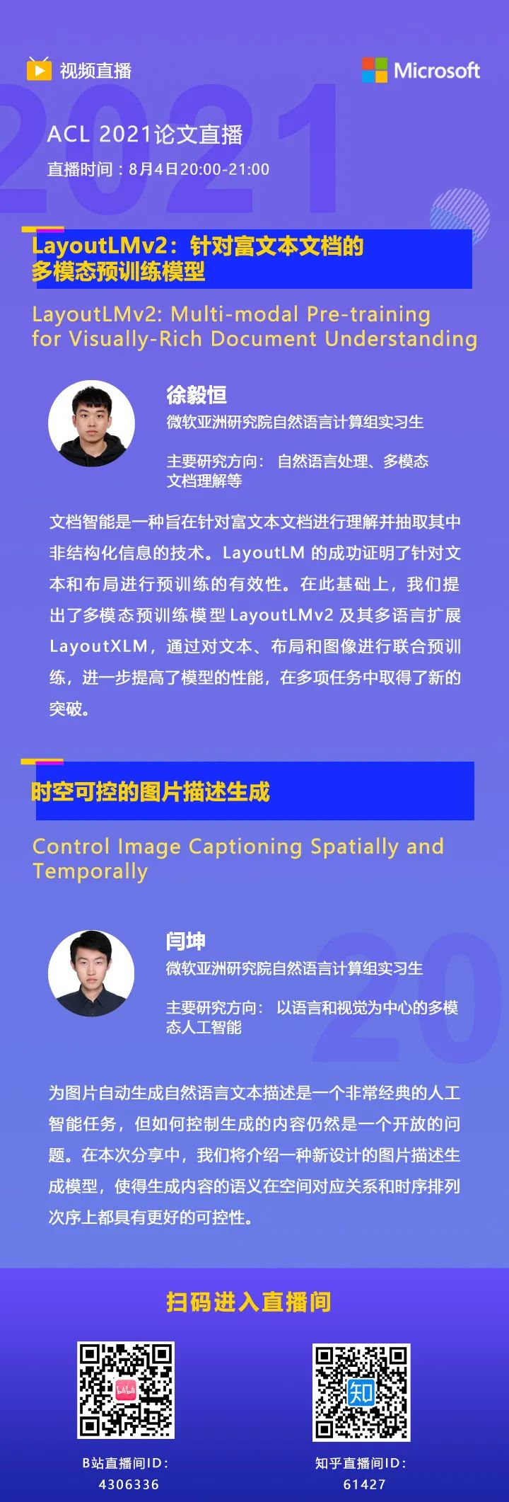 8月4日(今天),我们将邀请微软亚洲研究院自然语言计算组实习生徐毅恒和闫坤在 ACL 2021 分享专场中,为大家深度解读论文,届时欢迎大家扫码观看。