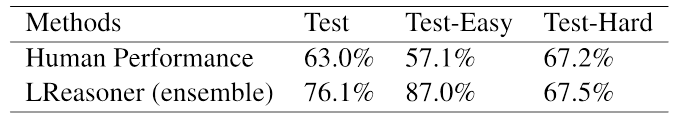 表1: 人类与 LReasoner 系统在 ReClor 数据集上的准确率对比