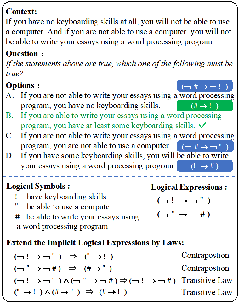 图2给出了一个 LSAT 中逻辑推理问题的例子——给定了一篇文章,一个问题和多个候选选项,要求从候选选项中选出最可行的答案(由绿色标记)。从例子中可以看出,为了回答问题,答题者需要从文章中抽取逻辑符号,例如 have keyboarding skill 还有 be able to use a computer。接下来还需要把逻辑符号组合成逻辑表达式,再通过逻辑规则(比如逆反规则,传递规则)对现有的逻辑表达式进行推理,从而拓展得出新的逻辑表达,最后对选项进行判断。由此可以看出,逻辑推理任务非常需要机器可以拥有理解逻辑论述并且进行复杂推断的能力。