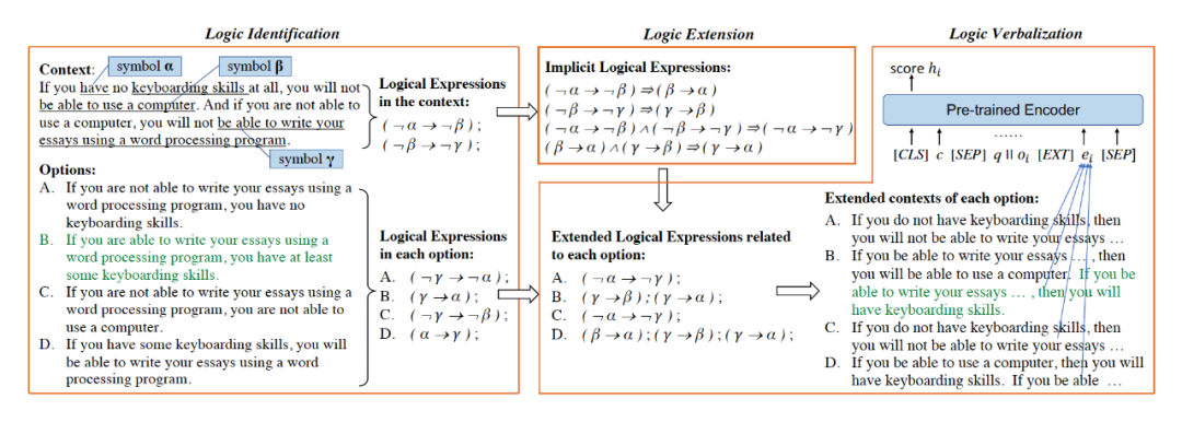 逻辑驱动的文本扩充框架(如图3所示)可以分成三个步骤:逻辑识别,逻辑扩充,逻辑文本化。(1)首先研究员们制定了一系列规则将文本和选项中的逻辑符号抽取出来,并考虑符号的否定以及符号之间的条件关系,将显式存在的逻辑表达式识别出来,作为之后逻辑推断的基本单元,如图3,根据 Context(上下文)抽取出了(¬α→¬β) 和 (¬β→¬γ)。(2)基于文本中识别出来的逻辑表达式,研究员们根据逻辑等价律做推断, 扩充出文本中隐式的逻辑表达式,如图3,在 Logic Extension(逻辑引申)中可以扩充出 (¬α→¬γ) 等逻辑表达式。(3)最后根据模板,将每个选项相关的扩充逻辑表达式转化成扩充文本,再和原始文本一起输入预训练模型,从而利用推导出来的逻辑信息匹配找到答案。