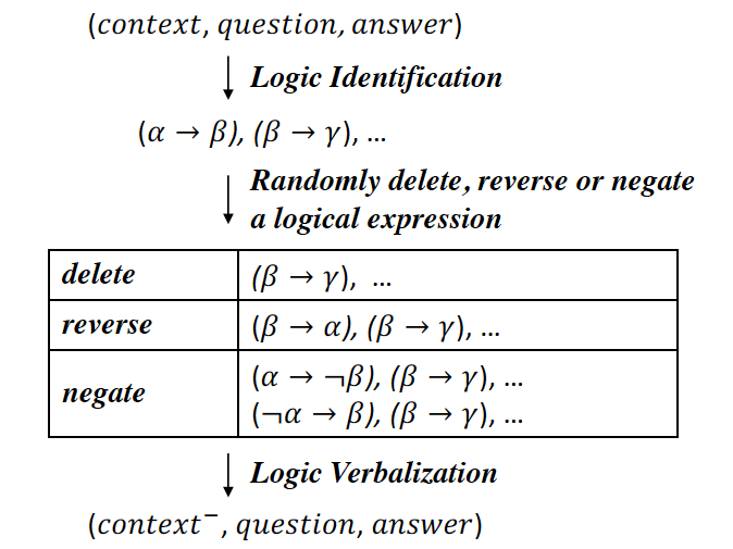 在逻辑驱动的数据增强算法中,研究员们参考了 SimCLR[2] 的思路,通过构造字面上相似但逻辑不同的样本,来训练模型以预测出支持答案的逻辑正确文本,从而让模型可以更好地感知到文本中的逻辑信息,尤其是逻辑否定和逻辑条件关系。研究员们使用了原始文本构成正样本,而负样本则是通过修改文本中抽取出的逻辑表达式,包括删除、条件逆转、否定操作,并将修改后的逻辑表达式转化成文本而构成(具体构造负样本的过程如图4所示)。