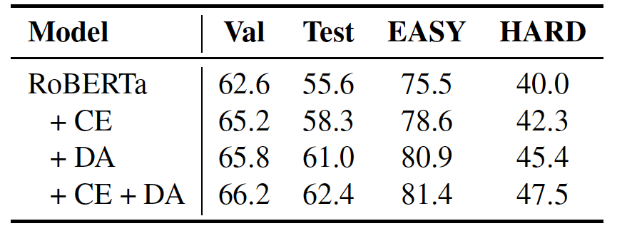 表2:消融实验结果(CE 和 DA 分别指代文本扩充框架和样本增强算法,RoBERTa+CE+DA 就是基于 RoBERTa 的 LReasoner)