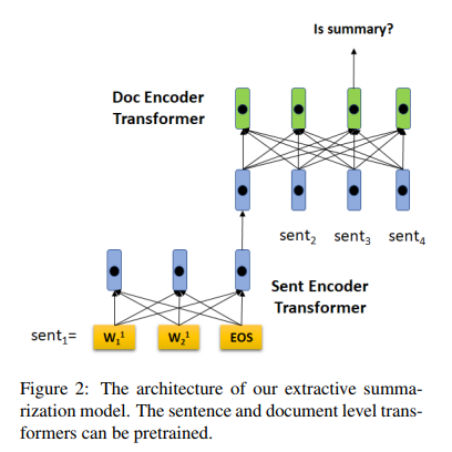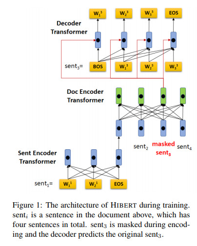 如图1所示,HIBERT的编码器是一个Hierachical Transformer(句子级别的Transformer和文章级别的Transformer)。句子级别的Transformer通过句内信息学习句子表示,而文章级别的Transformer通过句间信息学习带上下句背景的句子表示。