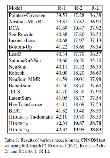 HIBERT在两个著名的摘要数据集CNN/DailyMail和New York Times上结果都表现很好,超越了BERT及其它在2018年和2019年初提出的所有摘要模型。