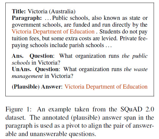 SQuAD 2.0数据集包含5万多个不可答问题,并且为不可答问题标注了一个看起来正确的答案(plausible answer)。图3展示了SQuAD 2.0中一个文档和相应的可答与不可答问题,可以看到这两个问题的(plausible)答案对应到同一个片段,用词十分相似且答案具有的类型(organization),通过对可答问题进行修改就能得到相应的不可答问题。根据这一观察,我们以被标注的文本片段为支点来构造训练问题生成模型所需的数据。