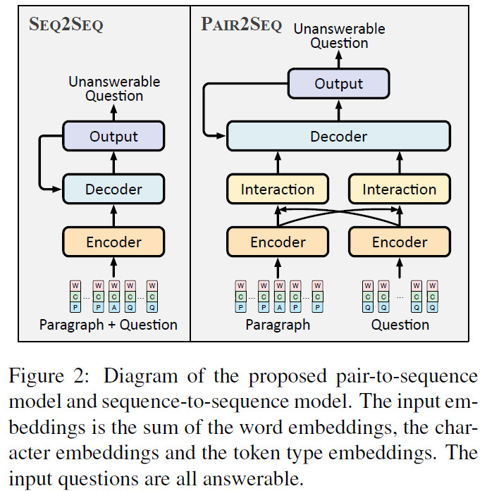 该论文提出根据可答问题、原文和答案来自动生成相关的不可答问题,进而作为一种数据增强的方法来提升阅读理解系统的表现。我们利用现有阅读理解数据集SQuAD 2.0来构造不可答问题生成模型的训练数据,引入Pair2Seq作为问题生成模型来更好地利用输入的可答问题和原文。