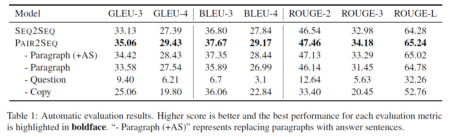 在阅读理解系统中,问题与文档的交互是最为关键的组成部分,受此启发,该论文提出Pair2Seq模型,在编码(encoding)阶段通过注意力机制(attention mechanism)得到问题和文档的加强表示,共同用于解码(decoding)。如表3所示,Pair2Seq模型在多个评价指标上超过Seq2Seq模型。