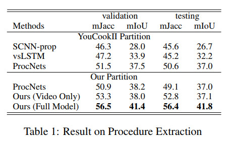 表6:不同模型在YouCook II数据集的Procedure Extraction任务上的实验结果