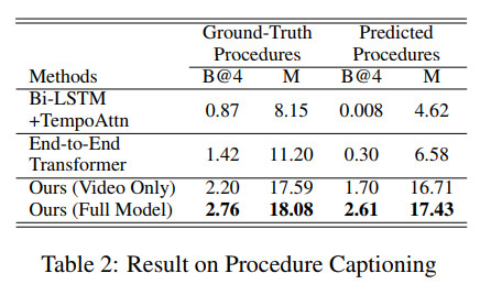 表7:不同模型在YouCook II数据集的Procedure Captioning任务上的实验结果