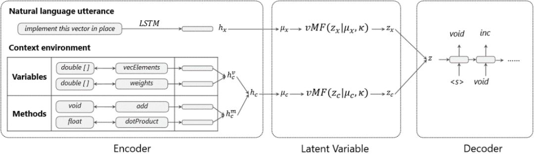 图9是基于上下文的检索模型,该模型是一个建立在变分自编码器(VAE)框架下的编码-解码(encoder-decoder)模型,将文本和上下文环境编码成一个潜层变量z,然后利用该变量解码出逻辑表达式。在检索的过程中,使用KL散度作为距离度量得到相似的样本。