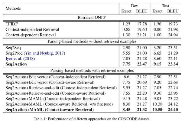 该论文在CONCODE和CSQA两个公开数据集上进行实验,可以看出结合检索和元学习取得了最好的成绩。