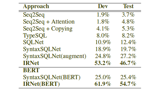 实验结果如表10所示,在Spider数据集上,IRNet实现了46.7%的准确率,比已有的最好方法提升了19.5%的准确率。同时,IRNet+Bert实现了54.7%的准确率。