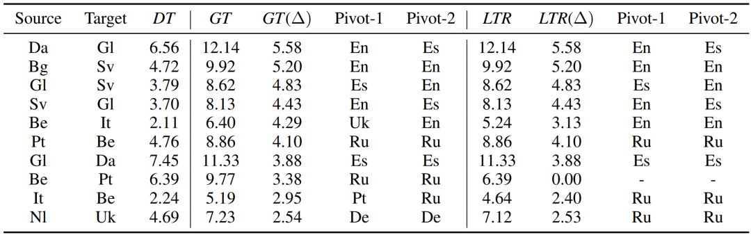 我们在20个语言一共294个语言对上进行了实验,来验证我们的无监督中转翻译以及LTR路径选择算法的性能。表11列出了部分语言对的实验结果,其中DT代表直接从源语言到目标语言的无监督翻译,LTR代表我们提出的中转算法,GT(Ground Truth)代表最好的中转翻译,也决定了我们方法的上限,GT(∆)和LTR(∆)分别代表GT和LTR相对于直接翻译DT的提升,Pivot-1和Pivot-2代表中转路径的两个中转语言(我们最多考虑三跳路径)。如果是一个两跳路径,那么Pivot-1和Pivot-2相同;如果是直接翻译,那么Pivot-1和Pivot-2为空。