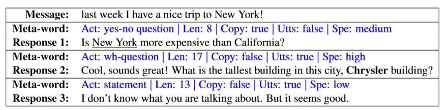 在这篇论文中,我们提出用meta-word来表示输入和回复间的关系。Meta-word代表了一组回复属性(如图14中的回复意图(Act),回复长度(Len)等)。利用meta-word进行对话生成的好处包括:(1)模型具有很好的可解释性;(2)通过订制meta-word,开发者可以控制回复生成;(3)情感,话题,人格等都可以定义为meta-word中的一个属性,因此诸如情感对话生成,个性化对话生成等热点问题都可通过该论文提出的框架解决;(4)工程师们可以通过增加或调整meta-word不断提升生成模型的性能。