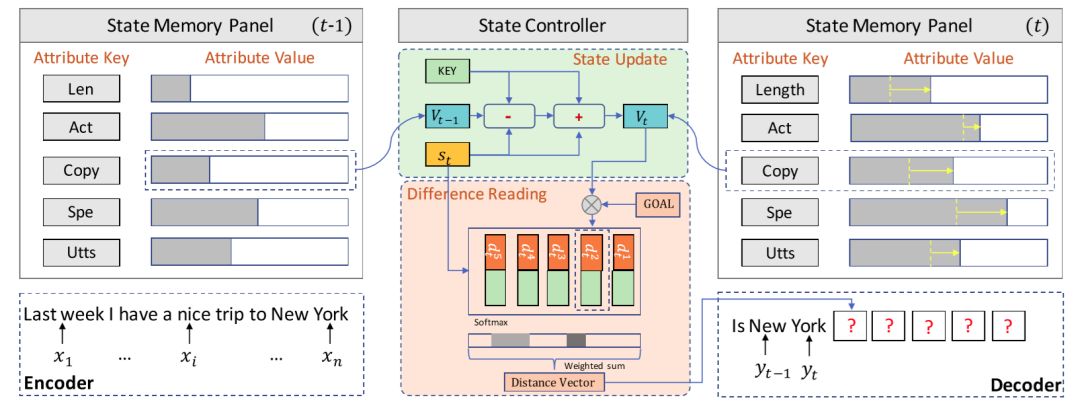 利用meta-word进行回复生成需要解决两个问题:(1)如何确保回复和输入相关;(2)如何确保回复能够如实地表达预先定义的meta-word。为了解决这两个问题,我们将meta-word的表达形式化成回复生成中的目标,提出了一个基于目标跟踪记忆网络的生成模型(如图15)。该网络由一个状态记忆板和一个状态控制器组成,前者记录生成过程中meta-word的表达情况,后者则根据当前已经生成的部分动态地更新记忆板中的存储并将目前的表达情况和最终表达目的的差距传达给解码器。在模型学习过程中,我们在传统的似然目标之外增加了一个状态更新损失,以使得目标追踪能够更好地利用训练数据中的监督信号。不仅如此,我们还提出了一个meta-word的预测方案,从而使得整个架构可以在实际中使用。