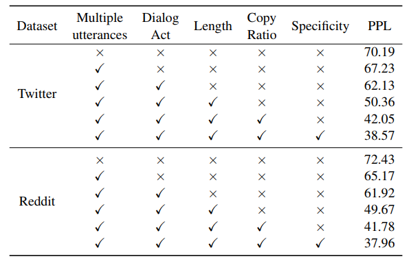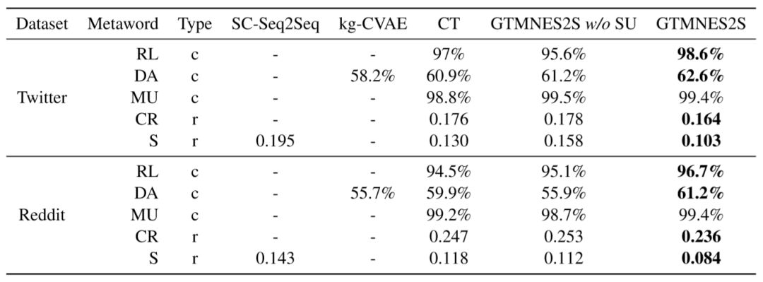 我们在Twitter和Reddit两个数据集上考察了生成回复的相关性、多样性、“一对多“关系建模的准确性、以及meta-word表达的准确性。不仅如此,我们还对生成结果进行了人工评测。实验结果如下: