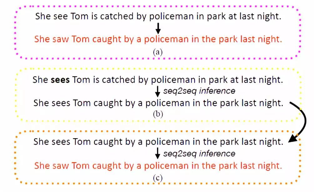 对于一个用于语法改错任务的seq2seq模型,其基本的训练数据为一个由原始句子和正确句子所组成的改错句对,如图1(a)所示。从理论上讲,只要有大量的训练数据,我们是能够得到一个相对完美的语法改错模型。然而实际上,这种改错句对的数量规模相当有限。因此,在训练数据并不充足的情况下,seq2seq模型的泛化能力就会受到影响,其导致的一个结果就是哪怕输入的句子稍稍变动一点,模型也可能会无法将其完全改正,如图1(b)所示。与此同时,我们还发现,对于一个含有多个语法错误的句子,单次的seq2seq推断往往不能完全将其改正,在这种情况下,我们可能需要用多轮seq2seq推断来对一个句子反复进行修改,如图1(c)所示。