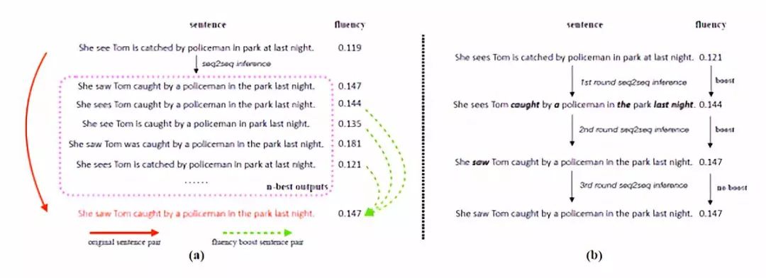 而流畅度提升推断(fluency boost inference)则是利用seq2seq模型对句子进行多轮修改,直到句子的流畅度不再提升为止。这种多轮修改的策略能够率先改掉句子的一部分语法错误,从而使句子的上下文更加清晰,有助于模型修改剩下的错误。