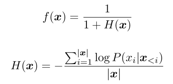 上式中P(xi|x<i)为给定上文x<i,P(xi)的语言模型概率。H(x)实质上为句子x的交叉熵,其取值范围为[0,+∞),因此f(x)取值范围为(0,1]。