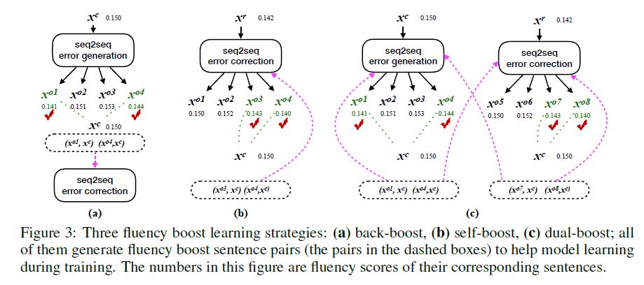 基于以上的几点想法,我们在传统seq2seq模型的基础上提出了一种全新的学习和推断机制——fluency boost learning and inference,如图2(a)所示。