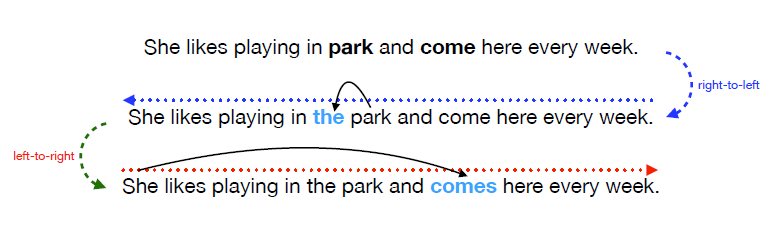 例如上图中的句子,用反向模型能够很容易地把冠词错误改正,这是因为冠词错误的修正更加依赖于冠词位置右边的上下文。但是反向模型在检测主谓一致这种错误类型时会存在一些劣势,因为主致一致错误的改正往往需要依赖位于谓语动词左边的主语的人称和单复数。而这一类型的错误又可以被正向模型发现并改正。