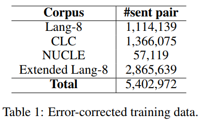 我们利用Lang-8、CLC、NUCLE这几个知名的语法改错数据集以及额外从Lang-8收集到的287万训练句对作为原始训练数据。我们的基本seq2seq模型是一个7层卷积seq2seq模型。