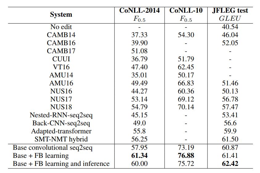对于流畅度提升学习,我们从10-best outputs中来筛选构造流畅提升句对,并且使用英语维基百科的语料作为正确文本来生成流畅句对。在实际模型训练过程中,我们强制规定在每一轮训练迭代过程中,用于训练的流畅句对数量不超过原始训练句对的数量。对于流畅度提升推断,我们使用了往返修改的策略,在流畅度提升的前提下,用反向和正向的seq2seq模型交替对句子进行修改。此外,我们使用了5元组语言模型和编辑特征对于beam search选出的12-best句子进行重排序,从而选出最好的结果作为单轮推断的输出。