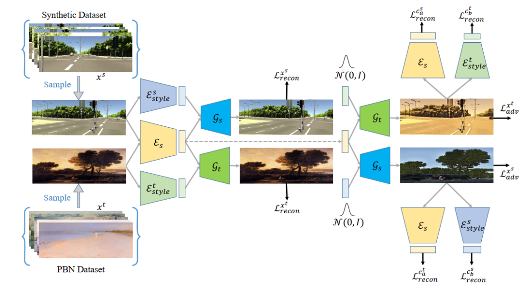 如图4所示,研究员们利用了图像到图像转换的框架去训练 STE 的编码器 Es。而为了使得网络可以适应多个风格的图像,并将通用的图像结构从图像中解耦出来,研究员们用一个风格数据集Painter By Numbers (PBN)作为目标域,合成数据作为源域,通过共有的结构编码器和两个私有的风格编码器,分别编码出源域和目标域的结构信息和风格信息。再利用图像自重建损失、潜层特征自重建损失和对抗损失结合的方式将结构信息和风格信息解耦。通过这种方式训练的结构编码器可以编码出通用的结构信息。